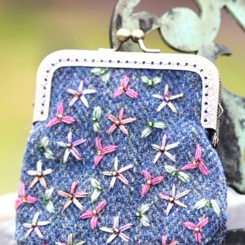 Harris Tweed is wonderful fabric to work with and this gorgeous coin purse shows it off beautifully with the embellishment of hand - embroidery in cotton threads and hand- beading with Czech glass beads. The purse is lined with cotton fabric and finished off with a detailed clasp. A beautiful addition to anyone's accessories collection.